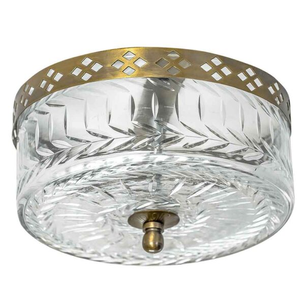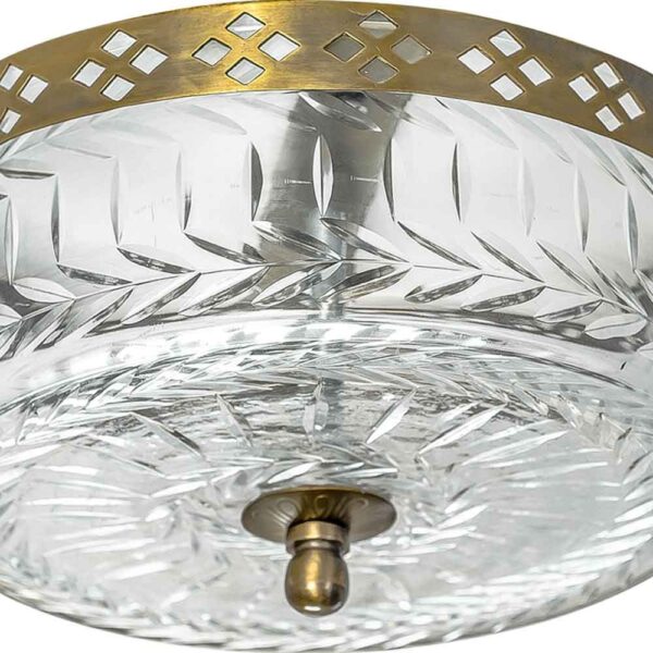 לי (פס) שלנו, צמודת תקרה עגולה ומתוקה. עשויה זכוכית בדוגמת עלים ופסים ומעוטרת בבסיסה בפס מוזהב דקורטיבי